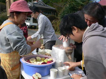 | 今年の恵みに感謝! 来賓の方々をお迎えして賑やかに収穫祭を行いました。 ごあいさつにもあったように「今だからこそ・・・・・・」 「食」を思う気持ちを大切にこの地に合った農作物を 自然農法で作り続けてゆきたいものです。 杵つきのあんこ餅、きな粉餅、ピカピカの新米で握ったおにぎり、 大学芋、どれもこれも美味しかったです。 ありがとう。 |