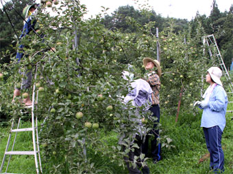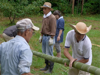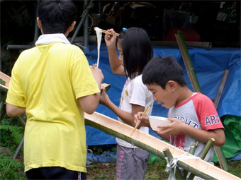 | お天気が心配されましたが、曇り空のままなんとか持ちました。 午前中はリンゴの摘果、田の寄せ刈り、流しそうめんの準備に分かれて 作業が始まりました。 お昼は流しそうめん。自分たちで準備した竹樋に流れてくる ソーメンの味は格別でした。大人も子どもも大満足でした。 午後はさつまいも畑の草取り。 じめじめしたお天気の作業、お疲れさまでした。 |