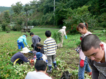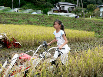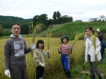 | このところ、秋雨前線の停滞できょうの稲刈りもお天気が心配されました。 でも降り続いていた雨も昨夜のうちにあがり、まずまずの稲刈り日和です。 刈って、まるって、おだがけに、と作業は順調に進み昼食に戻ってみると ピッカピカの新米が香りよく炊き上がっておりました。 それぞれにおにぎりにしていただきました。 午後は今晩が「十五夜のお月見さま」という事もありサツマイモを堀り 栗拾いをしてお土産に持ち帰りました。 |