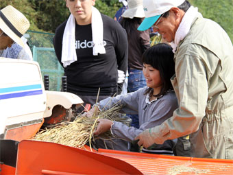 | きょうの作業はおだ掛けにしておいた稲の脱穀です。 このところずっと良いお天気が続いていたので稲の乾きもよく 今年もおいしい新米が収穫できました。 また昼食には、「炭火焼きさんま」に「さんまの刺身」それに新米ご飯、 大根葉のお漬物という秋ならではの定番メニューでお腹いっぱい! ごちそうさまでした。 午後は「陽光」のりんご狩りを楽しみました。 |