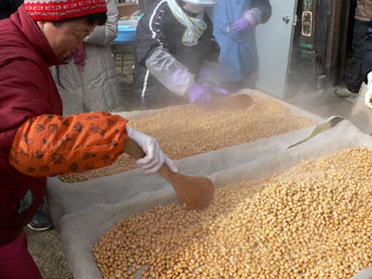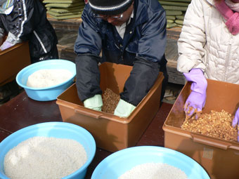 圧力鍋で大豆を蒸し、それを冷ましてから塩と麹を混ぜ潰して団子にし