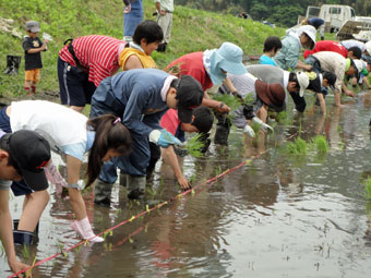 | 木々の緑がとても鮮やかになりよい季節になってきました。 本部前で少年団の入団式を行った後、田んぼへと移動し「こしひかり」「アクネもち」・・・ などの苗を一列に並んでヒモを張った線上に植えました。 泥濘で足をとられながらも皆さん、田植えを楽しんでいるように見受けましたが? いかがでしたでしょうか。 午後はとうもろこしの種まき、じゃがいもの芽かき、野菜の収穫もしました。 |