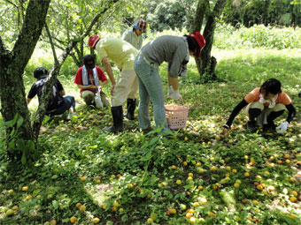 完熟梅拾い 塩水に漬けておやつにする