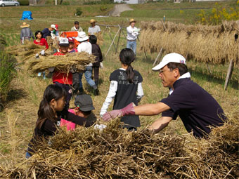 脱穀が終わった稲束をまとめます