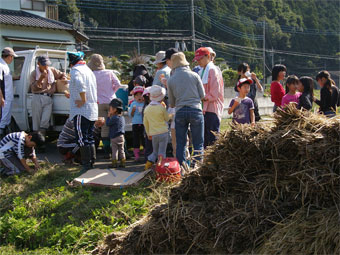 きょうの作業はしめ飾り用の古代米の刈り取り、そして前回刈った稲の脱穀でした。