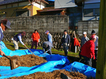 シートの上でたたいて 豆と殻を分けます