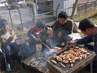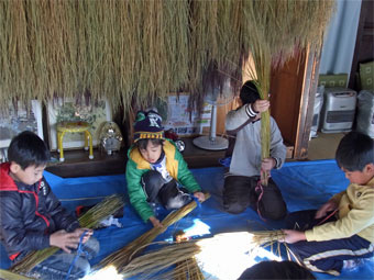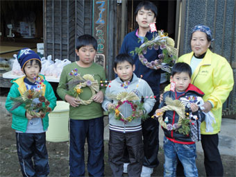 | 一昨日の初雪から急に寒くなりました。 きょうは、お正月用のしめ飾り(リース)作りと乾燥芋作りをしました。 少年団も一緒にそれぞれに工夫をこらして見事な出来栄えに仕上がりました。 乾燥芋も寒風にさらされて美味しく仕上がることでしょう。 |
