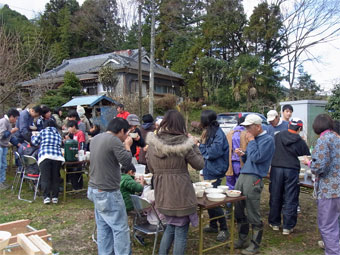 ![]() お昼は屋外で立食ランチ |