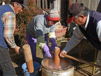 ![]() 色のついた餅米をこねます |