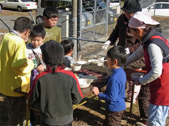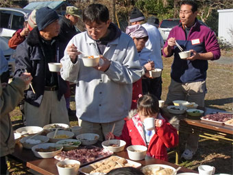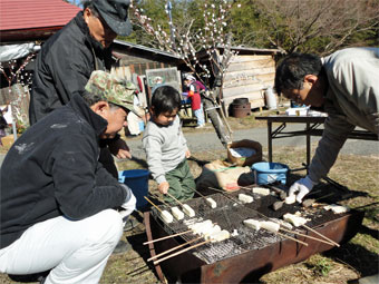 | 本年もどうぞよろしくお願い致します。 お正月気分もまだ残っているきょう、小正月の行事のひとつ 「繭玉まつり」を少年団も一緒に行いました。 みずの木にいろどりよくついたお餅をくっ付けて数本完成です。 鳥追いの行事で振る舞われる「田楽」もお昼には味わうことができました。 また会員さんが丹精込めて作ったという「いちご狩り」も楽しみました。 |