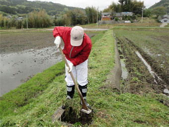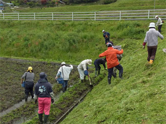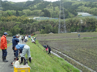 田植えに向けて田んぼの寄せ刈り、用水堀さらい、肥料ふりと作業が進められました。