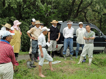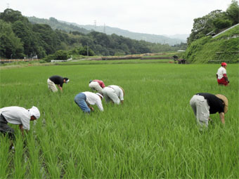 田んぼでは、専門家を呼んで稲作の講習会があり、その後田の草取りをしました。