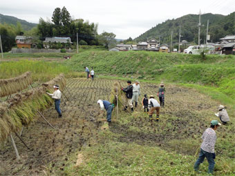 | 朝晩は大分冷え込むようになってきました。 農協からの通知にもあったように、平成23年度産米の安全性が確認されました。 県の行った米の放射性物質検査の予備調査、本検査とも玄米からの放射性物質は 検出されませんでした。安心で安全なお米ができました。 そんな訳できょうは、稲刈りです。 刈って、束ねて、おだに掛ける作業が手際よく進みました。 |