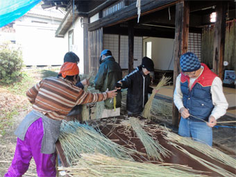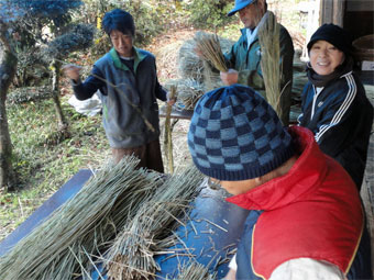 しめ飾り用に、乾燥し掛けてあった古代米のわらを、選別して次回の活動日に