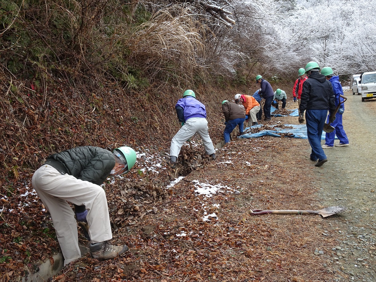 ひねり沢トレイル整備作業 令和7年総会記念写真 側溝落ち葉さらい 側溝落ち葉さらい 巣箱掛け