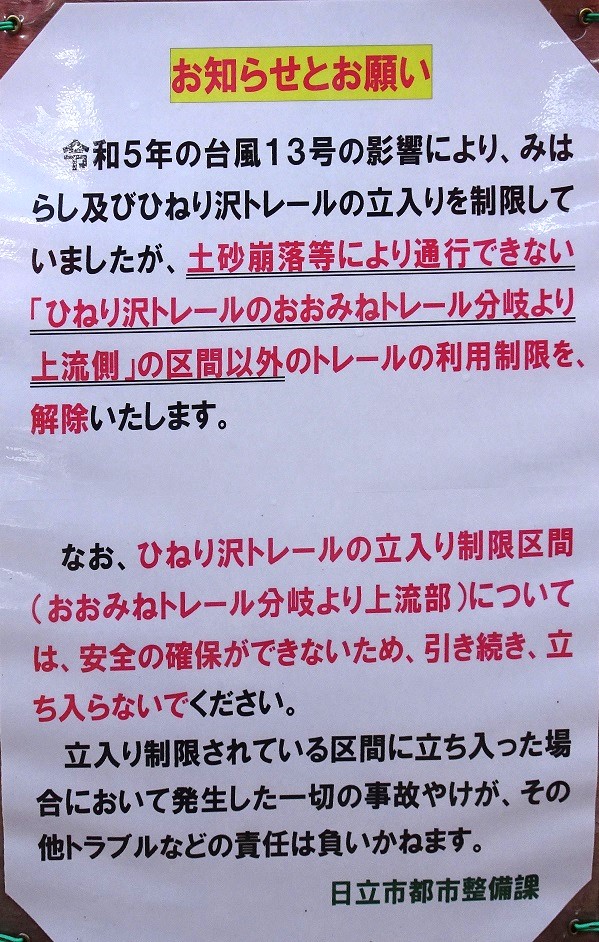 助川山のハイキング(特にひねり沢へのルート)は危険を伴うため日立市による当分の間立ち入り禁止となった。